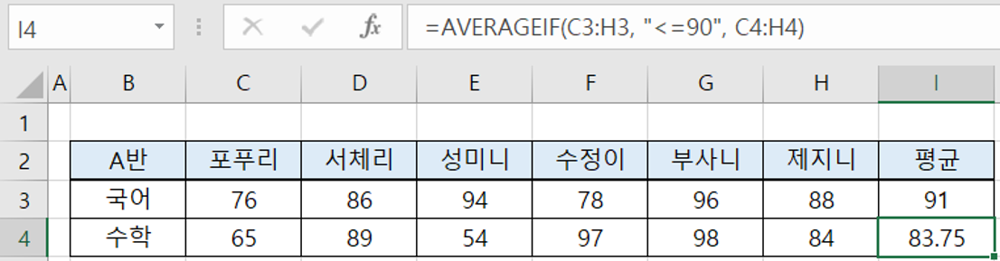 따라서 I4 셀에 아래와 같이 AVERAGEIF 함수를 입력하면 조건(국어 점수가 90점 이하인 학생)에 맞는 셀의 평균(수학 점수 평균)을 구할 수 있습니다.