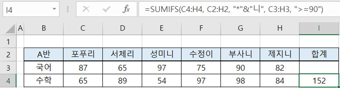 이번에는 이름이 '니'로 끝나면서 국어 점수가 90점 이상인 학생의 수학 점수 합계를 구해보겠습니다.
