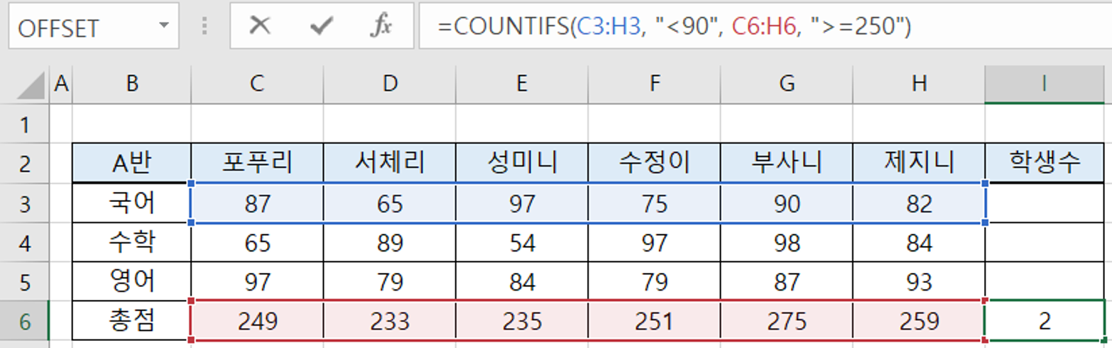 첫번째 조건은 "국어 점수가 90점 미만"이므로 [조건1을 충족하는지 판단할 범위]는 "국어 점수"인 C3:H3 영역이고, [조건1]은 "<90"입니다.