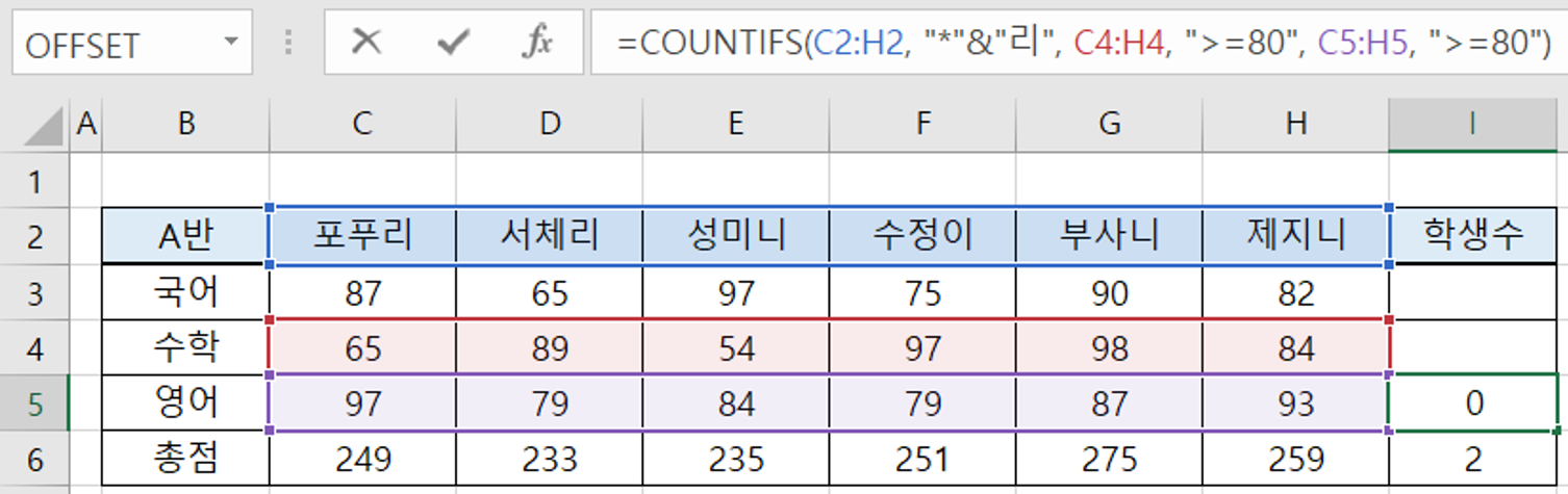 첫번째 조건은 "이름이 "리"로 끝나는 것"이므로 [조건1을 충족하는지 판달할 범위]는 "학생들의 이름"인 C2:H2 영역이고, [조건1]은 "*" & "리"입니다.