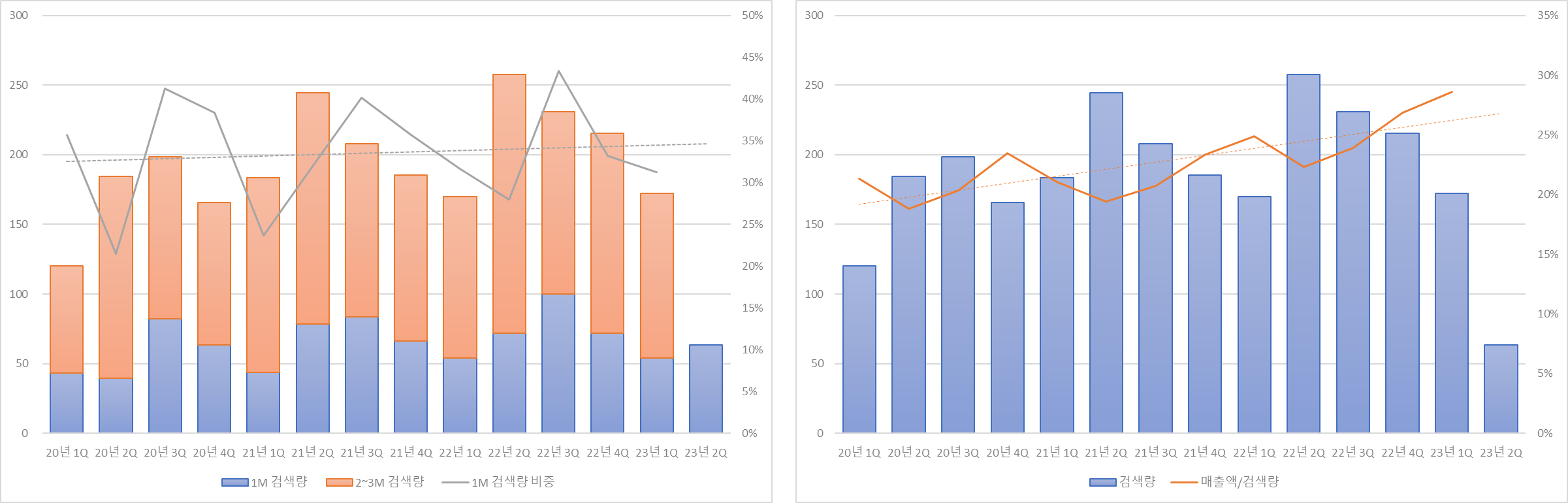 - 브랜드엑스코퍼레이션의 23년 2Q 매출액은 매출액/검색량 28%, 1M 검색량 비중 33% 가정하여 538.38억원으로 추정