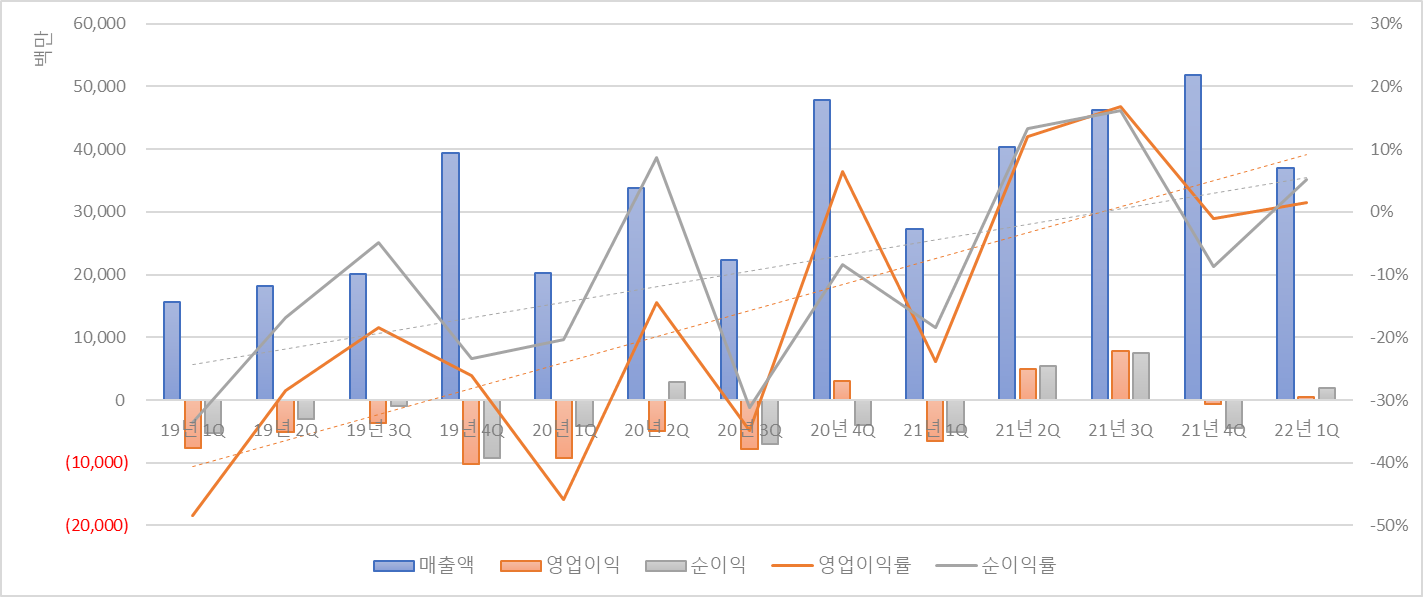 • 22년 1Q 매출 369.79억원, 영업이익 5.37억원, 순이익 19.07억원 공시